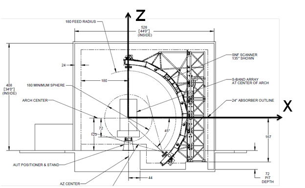 The spherical measurement surface includes the complete upper hemisphere and extends to 45° below the horizon. A theta over phi positioner movement allows the center of gravity of a heavy antenna under test to remain centered over the phi axis. Theta axis motion extends below floor grade to allow low angle scanning while the AUT is conveniently located at floor level. The precise measurements of electromagnetic Near-fields over the spherical surface are mathematically transformed to far-field antenna patterns, allowing extremely large apertures to be characterized.