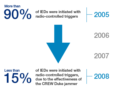 When SRC received a contract from the Army in 2005, more than 90% of IEDs were initiated with radio-controlled triggers. By 2008, after our CREW Duke system deployed to theatre, that percentage dropped to less than 15%.