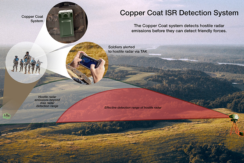 SRC's Copper Coat counter-intelligence, surveillance, and reconnaissance (ISR) system is a wearable, passive radar detection and alert system that enables dismounted warfighters to detect GSRs beyond their effective range in a spectrum congested environment. With its embedded antenna, the Copper Coat system observes a threat, detects and classifies the RF signal and generates a notification. An extremely low-size, weight and power system worn by soldiers, the Copper Coat unit discretely alerts the operator via notification on their Tactical Assault Kit or an audio signal through their headset, delivering critical intel to help warfighters avoid detection and disrupt the enemy's command.