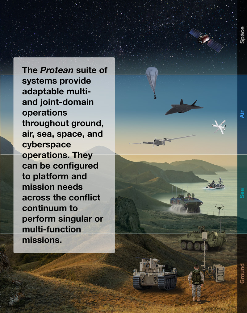 SRC's Protean® suite of systems provide the flexibility to seamlessly accommodate current and emerging capabilities into a platform that provides best-of-breed performance to keep pace with the evolving marketplace and battlespace. These systems are offered in a variety of form factors for various size, weight and power (SWaP) constraints. Each system can be tailored and scaled for mission requirements by swapping out commercial off-the-shelf (COTS) or other standardized cards. The Protean suite of systems provide adaptable multi- and joint-domain operations throughout ground, air, sea, space, and cyberspace operations. They can be configured to platform and mission needs across the conflict continuum to perform singular or multi-function missions.